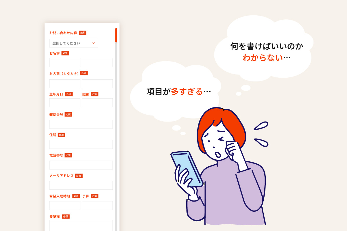不動産会社のフォームでは、できるだけ多くの情報を最初から取得したいという理由で、項目を増やしてしまいがちです。